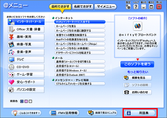 画面左下にある「用語集」ボタンをクリックするとパソコンについての用語集が開きます。