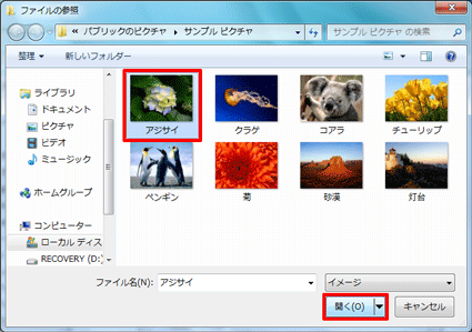 お好みの画像をクリックし、「開く」ボタンをクリックします。