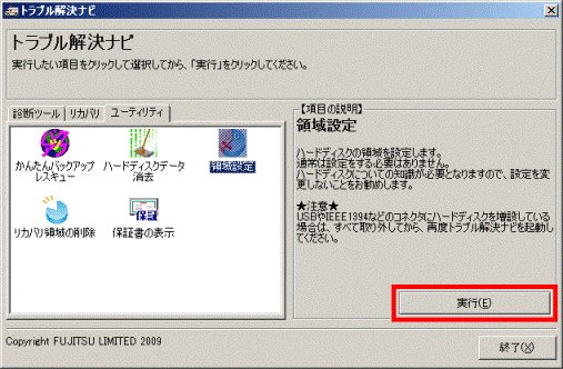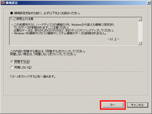 ハードディスクの領域を再設定する前には必ず、必要なデータを外部メディア(CDやDVD)にバックアップしてください。