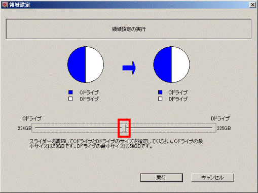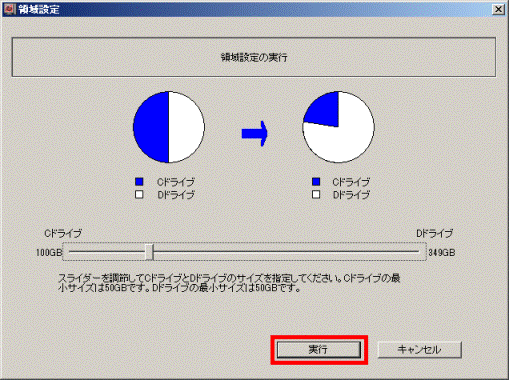 つまみを右に動かすと、Cドライブの領域(サイズ)が大きく、Dドライブの領域(サイズ)が小さくなります。 - 割り当てる領域(サイズ)を設定したら、「実行」ボタンをクリックします。