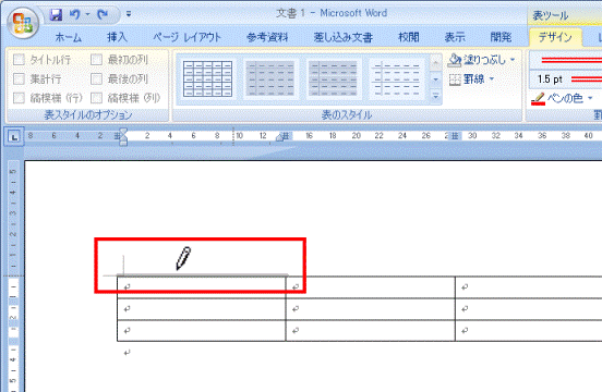 「ドラッグ」とは、マウスのボタンを押したままマウスを動かし、マウスポインターを目的の場所に移動させる操作です。 - 「表ツール」の「デザイン」タブをクリックします。