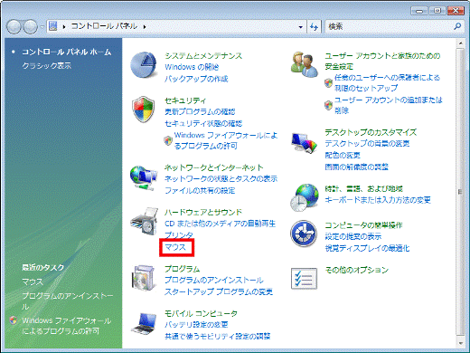 「ハードウェアとサウンド」がないときは、「マウス」アイコンをクリックします。
