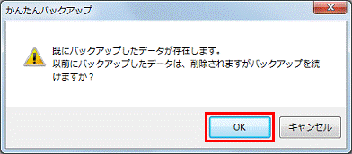 上書きしても問題ない場合は、「既にバックアップしたデータが存在します。」と表示されたあとに、「OK」ボタンをクリックします。