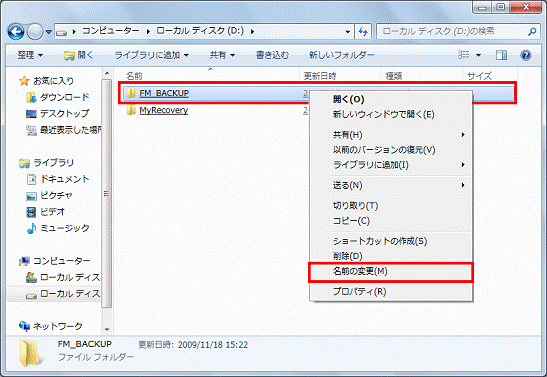 - 「FM_BACKUP」フォルダーを右クリックし、表示されるメニューから「名前の変更」をクリックします。
