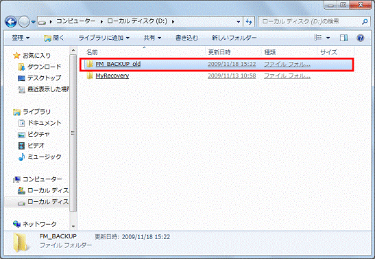 そのため、上述の手順で名前を変更したフォルダーから復元したい場合は、「FM_BACKUP」フォルダーに名前を変更した後で、かんたんバックアップを起動してください。