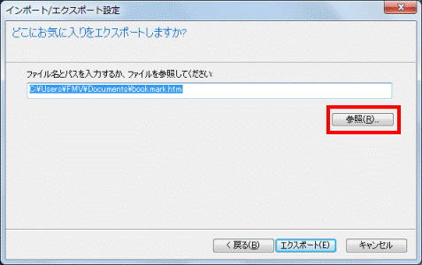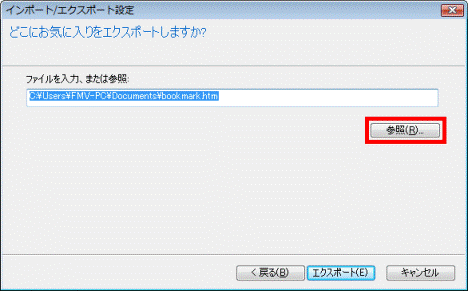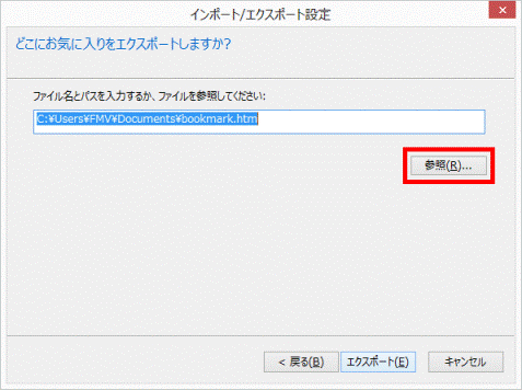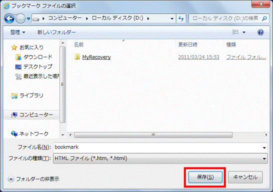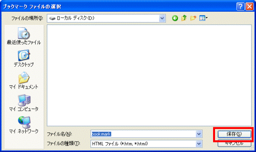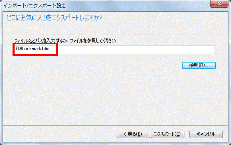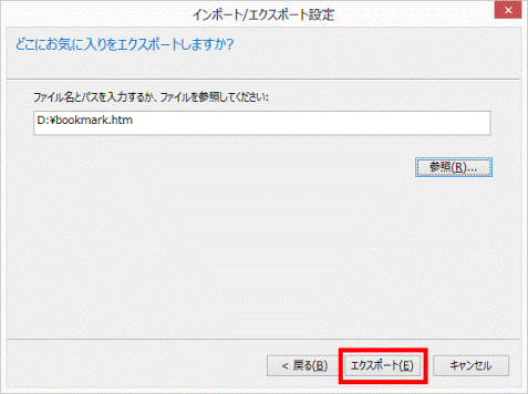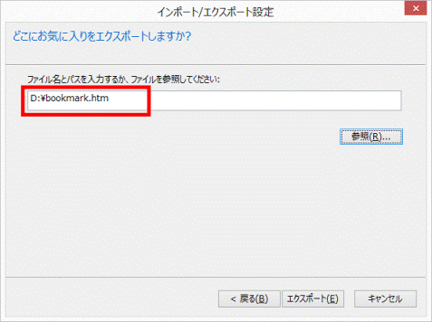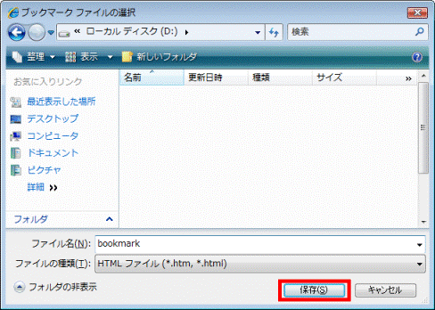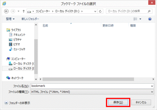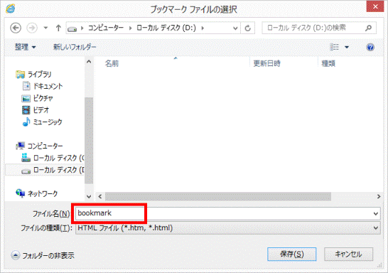 「ファイル名とパスを入力するか、ファイルを参照してください」欄に、「D:¥bookmark.htm」と入力されたことを確認します。