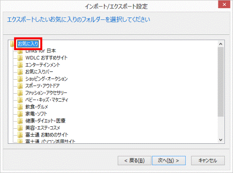 - 「エクスポートしたいお気に入りのフォルダーを選択してください」と表示されます。