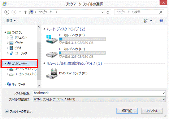 パソコンのハードディスクやフロッピーディスク、CD、DVDにデータを保存する方法を教えてください。 - バックアップした「お気に入り」を元に戻す方法は、次のQ&Aをご覧ください。