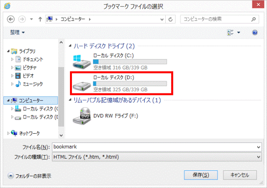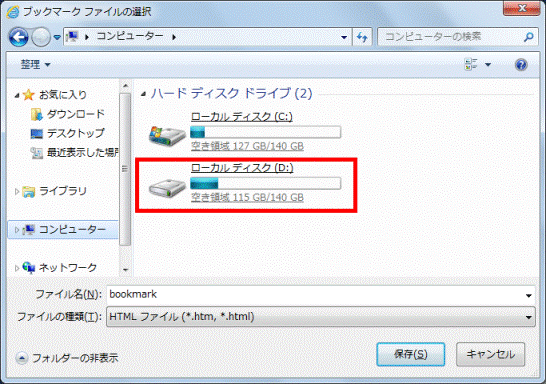 ここでは例として、お気に入りのデータを、ローカルディスク(D:)(または「(D:)」)に保存します。