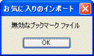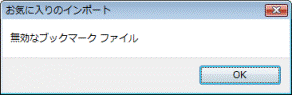 例えば、Internet Explorer 6 〜 Internet Explorer 7で、Internet Explorer 8の「お気に入り」をインポートしようとすると、「無効なブックマーク ファイル」と表示されます。