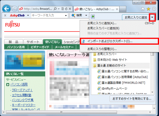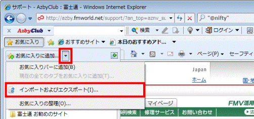 - 「お気に入りに追加」ボタンの右側にある「▼」ボタンをクリックし、表示されるメニューから「インポートとエクスポート」をクリックします。