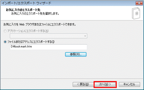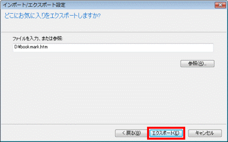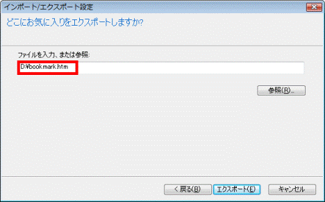 「ファイルを入力、または参照:」欄に、「D:¥bookmark.htm」と入力されたことを確認します。
