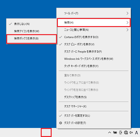 スタートメニューで文字を入力すると、検索欄が自動的に表示されます。 - 検索欄を表示したい場合は、タスクバーの何もないところを右クリックし、表示されるメニューから「検索」→「検索ボックスを表示」の順にクリックします。
