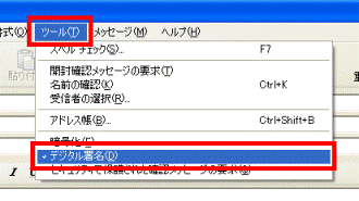 - 送信するメールの画面で、「ツール」メニュー→「デジタル署名」の順にクリックし、チェックを外します。