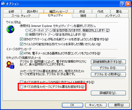 - 「セキュリティで保護されたメール」の項目の、「すべての送信メッセージにデジタル署名を追加する」をクリックし、チェックを外します。