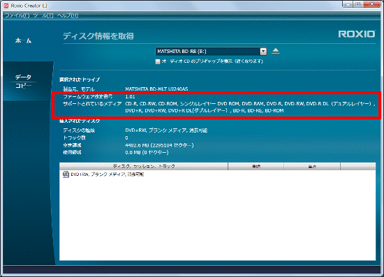 - 「CD」、「DVD」、または「ブルーレイ ディスク」の右側に表示される一覧で、使用できるメディアを確認します。