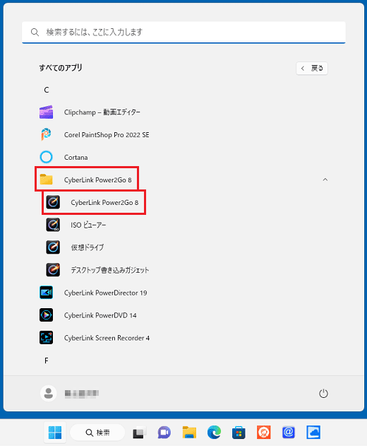 「スタート」ボタン→右上の「すべてのアプリ」→「CyberLink Power2Go(数字)」→「CyberLink Power2Go(数字)」の順にクリックします。