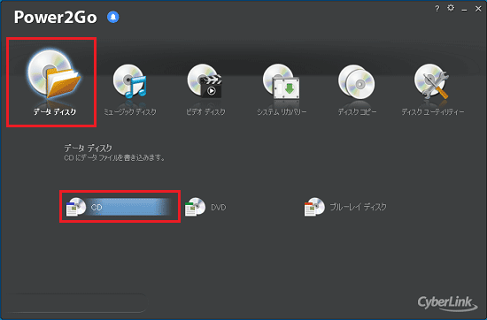 「データ ディスク」にマウスポインターを合わせ、表示される「CD」をクリックします。