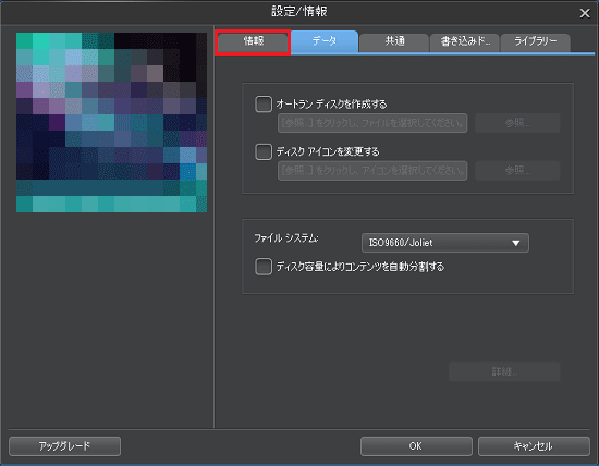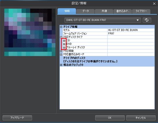 (「CD」、「DVD」、「ブルーレイ ディスク」すべての項目を表示した場合の例) - 「×」ボタンをクリックし、「設定/情報」を閉じます。