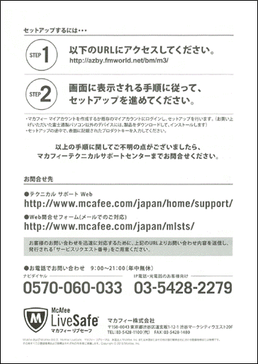『マカフィー リブセーフ 3年無償版 セットアップガイド』が、A5サイズの紙で添付されています。