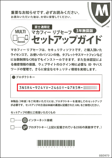 『マカフィー リブセーフ 3年無償版 セットアップガイド』にプロダクトキー(25桁の英数字)が記載されています。