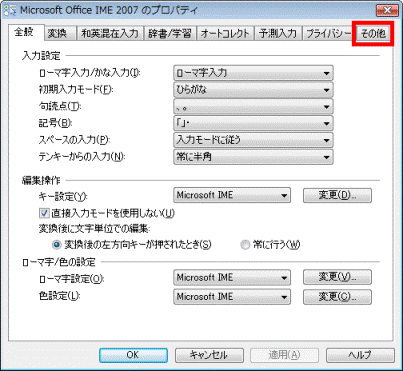 - 「Microsoft Office IME 2007のプロパティ」が表示されます。