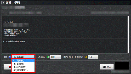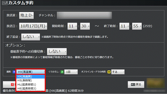 「青」ボタンを押します。 - 「カーソル」ボタンを押して、番組を録画するときの画質を選択し、「決定」ボタンを押します。アドバイス
