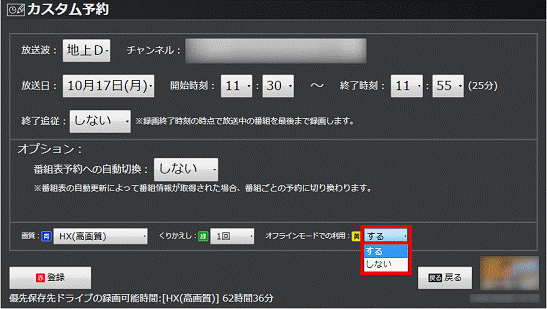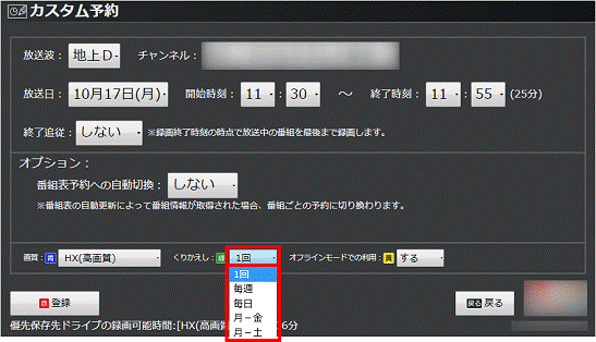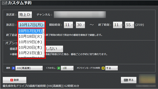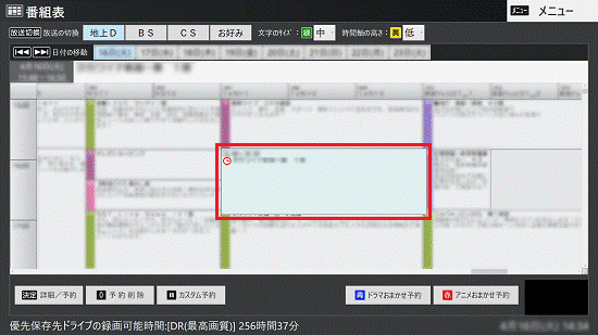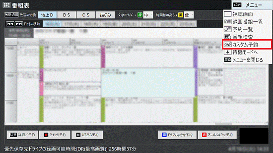 カスタム予約とは、番組表に表示されていない番組などを、手動で設定できる機能です。