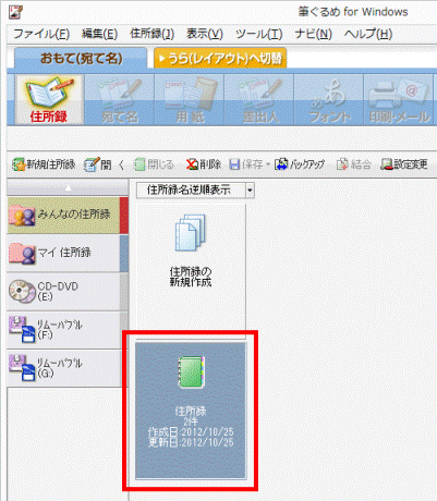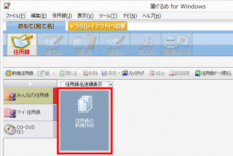 筆ぐるめで、おもて(宛て名)を作成する方法は、次のとおりです。