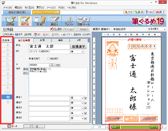 「前へ」ボタン、「次へ」ボタン、またはひらがなのボタンをクリックして任意の宛て名を選択し、編集します。