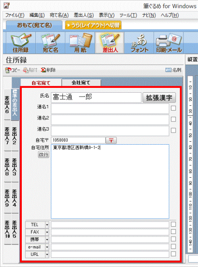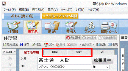 [筆ぐるめ Ver.19] 宛先を登録(追加)する方法を教えてください。 - 電話番号やメールアドレスなど、おもて(宛て名)に表示しない項目を登録する場合は、「自宅」タブまたは「会社」タブをクリックします。