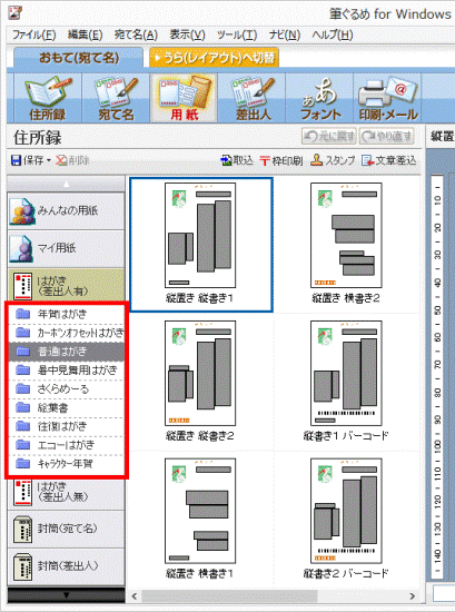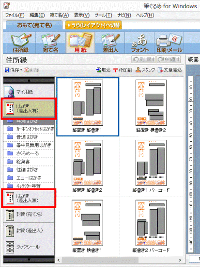 - お好みで、「はがき(差出人有)」または「はがき(差出人無)」をクリックします。