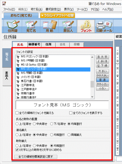 (宛て名の「氏名」を選択した例) - お好みのフォントや、大きさなどを設定します。