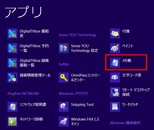 - 「Windows アクセサリ」にある「メモ帳」をクリックします。
