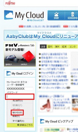 - パスワードを入力する欄を右クリックし、表示されるメニューから、「貼り付け」をクリックします。アドバイス