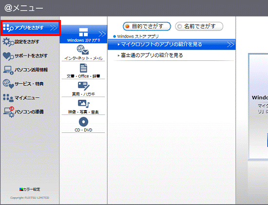 メニュー項目の「アプリをさがす」をクリックします。