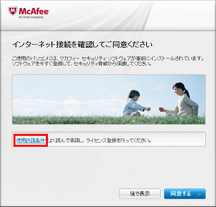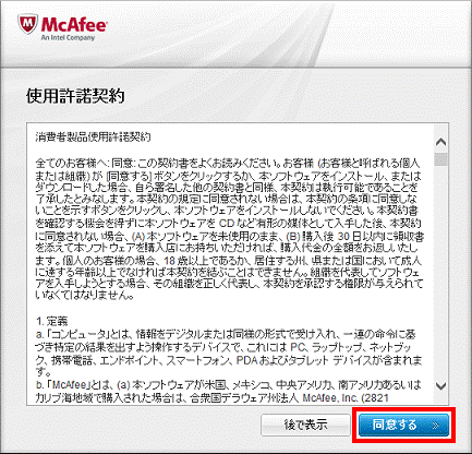消費者製品使用許諾契約の内容をよく読み、同意する場合は、「同意する」ボタンをクリックします。