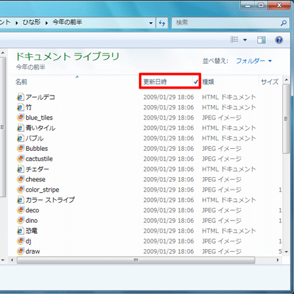 「名前」「更新日時」などの見出しの右側に、チェックマークがあるかどうかを確認します。