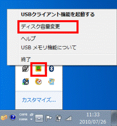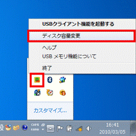 - 表示されるサムネイルから、「USBクライアント機能」アイコンを右クリックし、表示されるメニューから「ディスク容量変更」をクリックします。