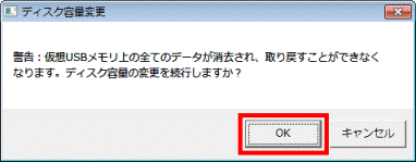 - 「警告:仮想USBメモリ上の全てのデータが消去され、取り戻すことができなくなります。」と表示されます。