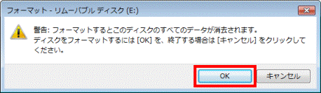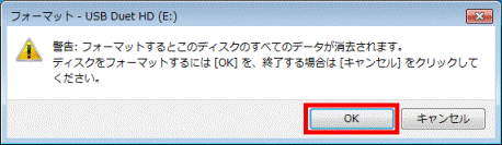 - 「警告:フォーマットするとこのディスクのすべてのデータが消去されます。」と表示されます。