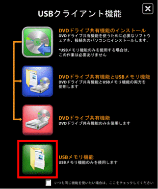 USBメモリ機能とは、USBクライアント機能の1つで、ハードディスクの一部を仮想USBメモリとして使用するための機能です。