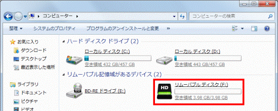 「自動再生」などが表示された場合は、「×」ボタンをクリックします。 - 「HD」と書かれた、リムーバブルディスクのアイコンが表示されていることを確認します。