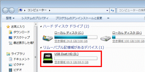 このため、リカバリやマイリカバリを実行すると、「USB Duet HD(E:)」または「リムーバブルディスク(E:)」のデータも削除されます。