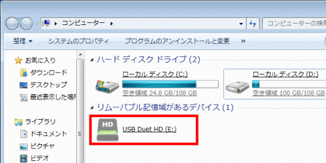 USBクライアントポートを搭載した機種の「コンピューター」に表示される「USB Duet HD(E:)」または「リムーバブルディスク(E:)」は、仮想USBメモリの領域です。