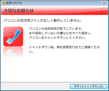 パソコンの空冷用ファン(CPUファン)が正しく動作していない場合に表示されます。