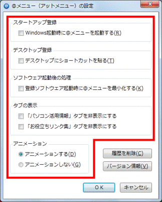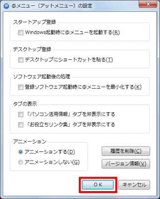「Windows起動時に@メニューを起動する」をクリックしチェックを付けると、パソコンが起動したときに@メニューも起動します。 - デスクトップ登録