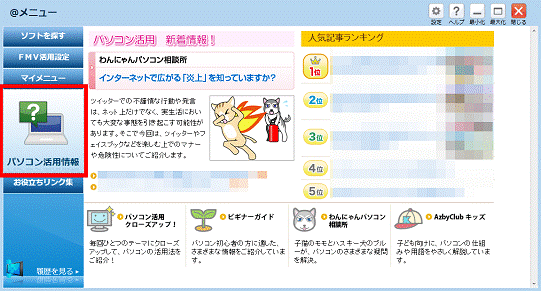 画面左側の一覧にある「パソコン活用情報」をクリックすると、パソコンの活用情報や使いこなし情報の一覧が表示されます。