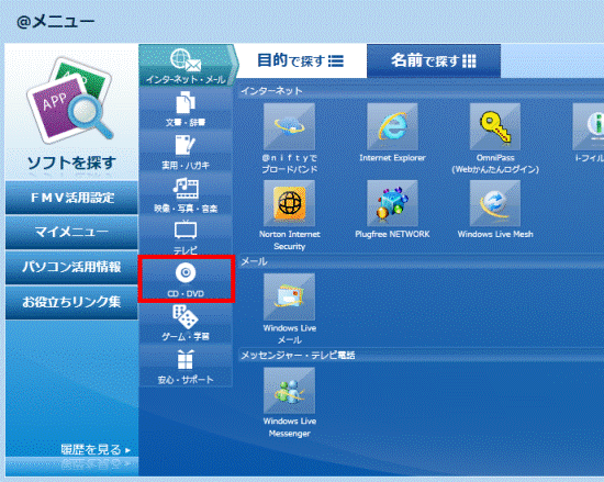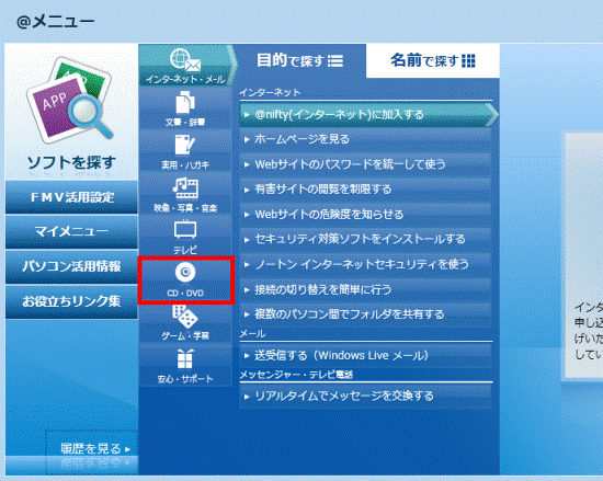 - 画面左側にある「CD・DVD」ボタンをクリックします。