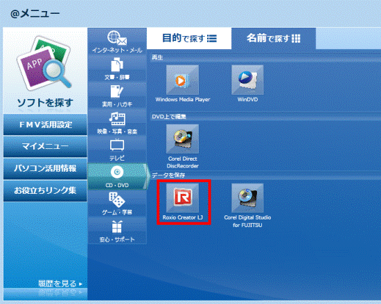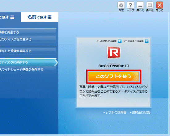 - 「データを保存」項目の「Roxio Creator LJ」をクリックします。